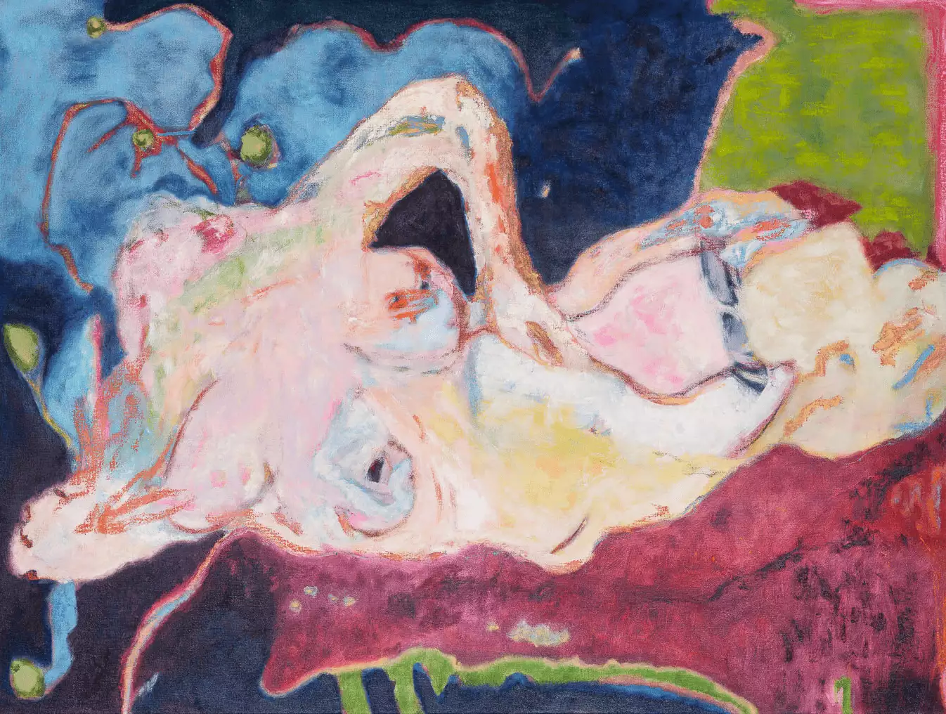 Lyra artist Sarah Dwyer is serious about the body. Her dynamic, large-scale abstract works depict amorphous forms that recall limbs, hands, and feet in vibrant color. The artist’s interest in the corporeal extends to her technique, which involves a dramatic dance with the canvas, ending with a daringly full-bodied application of paint that indexes the artist’s own physicality. Dwyer’s work has been exhibited internationally, from Saatchi Gallery in London to Wooster Projects in New York City. In October, she will be the subject of a solo exhibition at Bridgette Mulholland in Paris. Read on for our interview with Sarah Dwyer, whose work is currently on view in Lyra exhibition “I’m Not Afraid of Ghosts.”