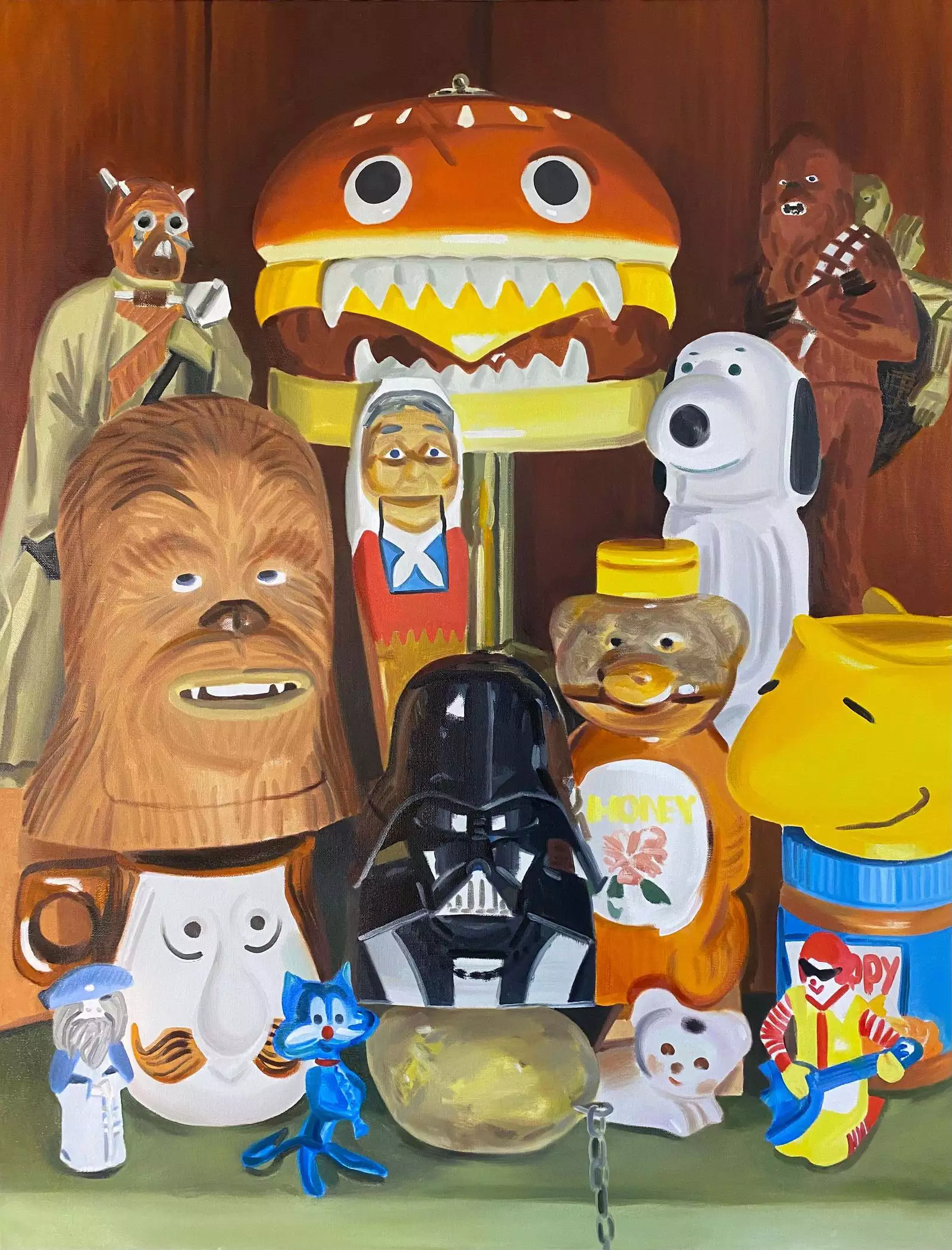 Ulala Imai paints scenes drawn from both her familial life and popular culture. She works in her home, transforming her children’s toys, quotidian foods, and other household items into mysterious and lifelike subjects. A masterful oil painter, she relies on just a few brushstrokes to realize her luminous images. Arranging disparate objects in whimsical combinations, Imai’s subtle associations infuse her paintings with the latent tension of interpersonal dynamics. A still life painter, Imai turns the materials of her specific family life into repositories for the more universal human exchanges that surround them.