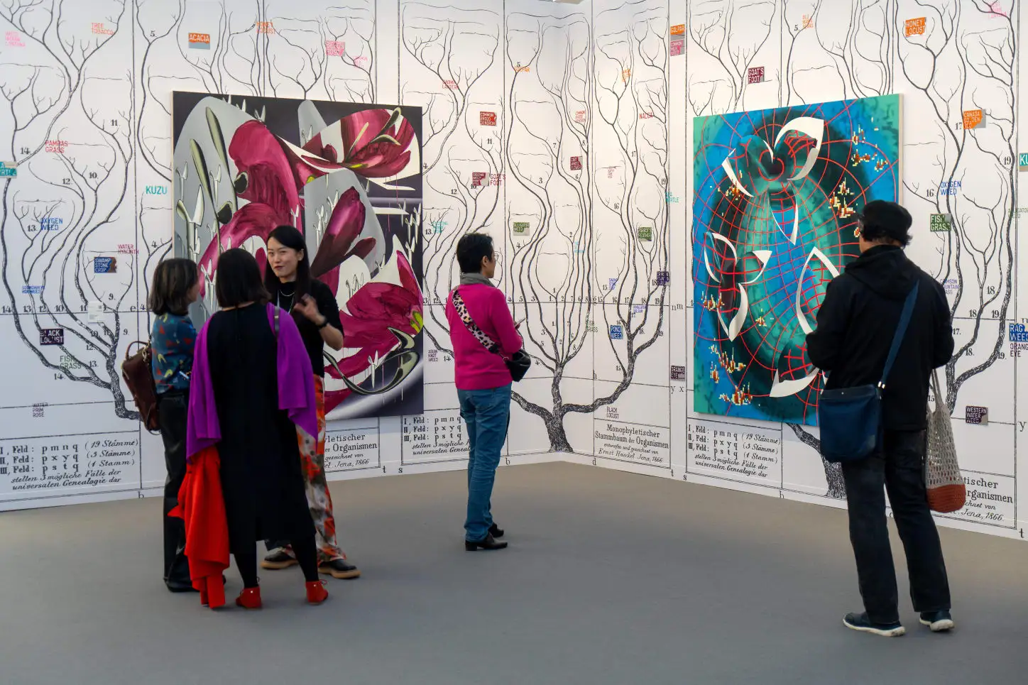 Visitors looking at a work by Leda Bourgogne presented by BQ at Art Basel in Basel 2023.